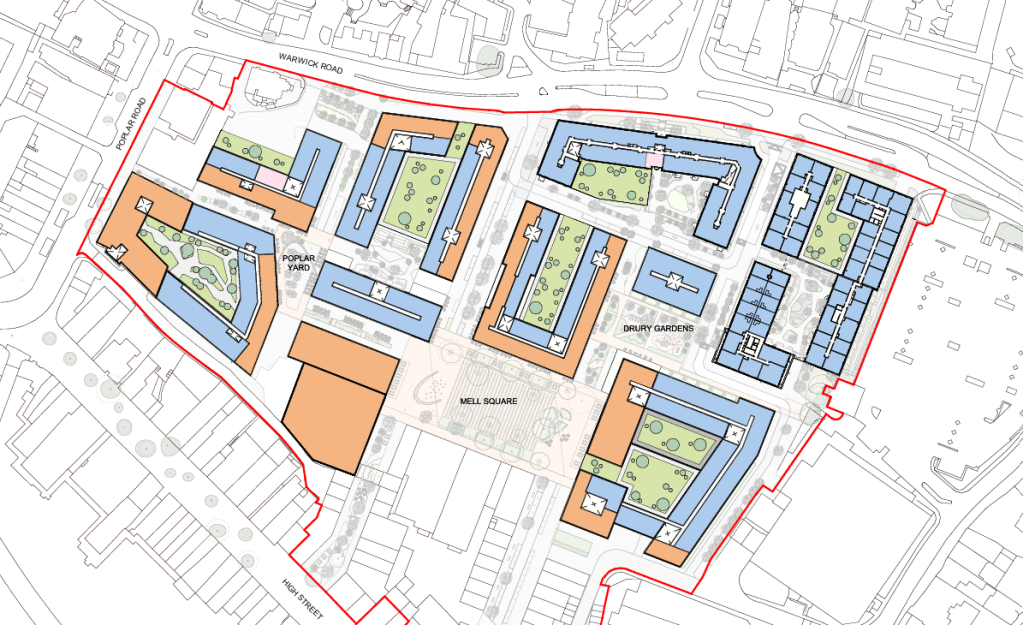 Planning reference: PL/2025/00547/MAJFDW refers to a – Hybrid planning application comprising full planning application for site clearance and demolition of all existing buildings and the construction of residential floor space and associated amenity space (Use Class C3), lower and ground floor commercial floor spaces (Use Class E), public realm works, hard and soft landscaping, access, parking, drainage, and all other associated works. Outline planning application, with all matters reserved for the site clearance, demolition and the construction of phased mixed-use development comprising of flexible residential and town centre floor space (Use Classes E, C1, C2, C3, F1 and Sui Generis), associated public realm works and landscaping, access, parking, drainage, and all other associated works.